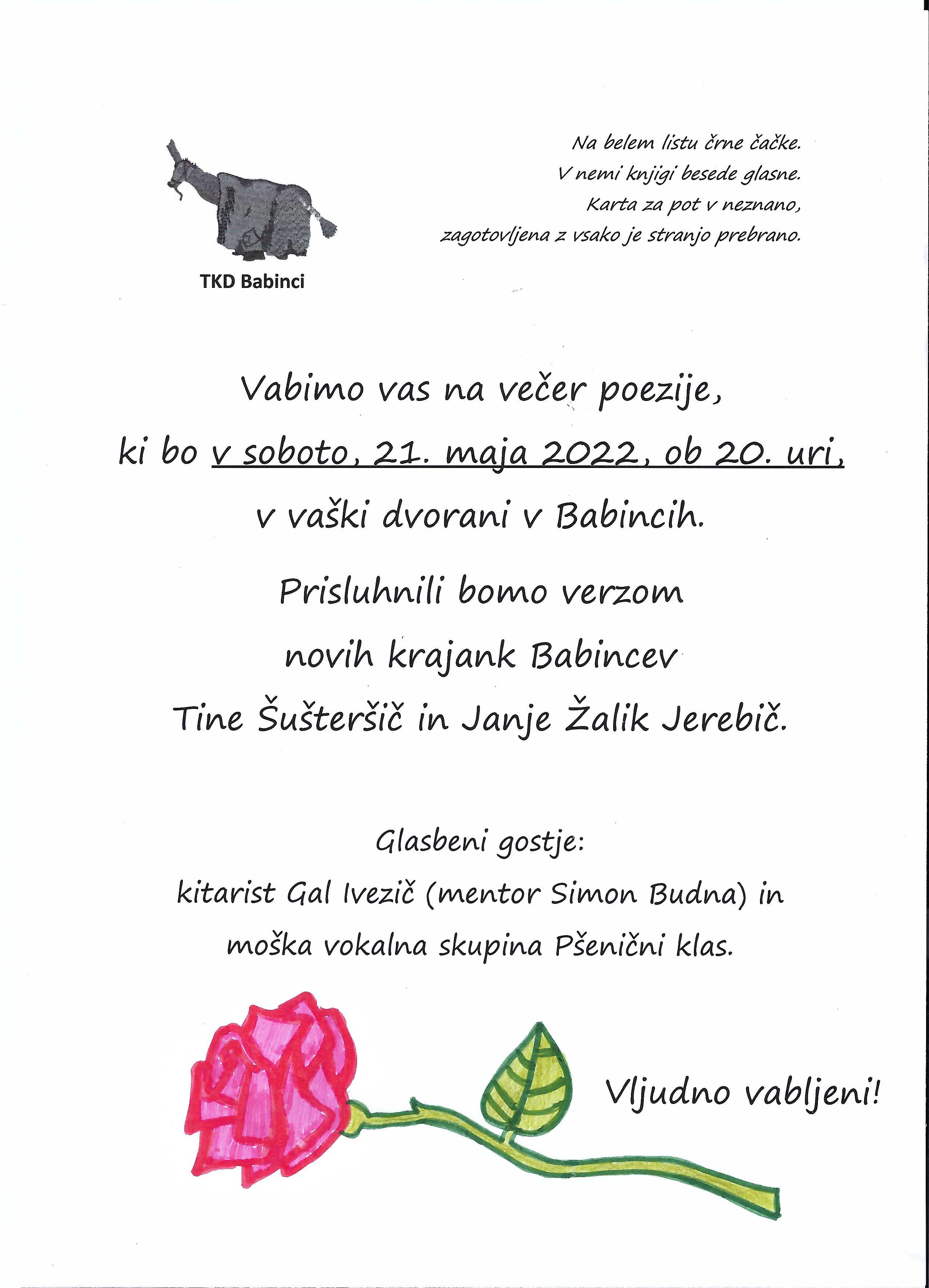V sklopu tedna kulture bomo v Turistično kulturnem društvu imeli "VEČER POEZIJE". Pripravili in izvedli ga bosta naši novi krajanki in članici društva Tina Šušteršič in Janja Žalik Jerebič.
