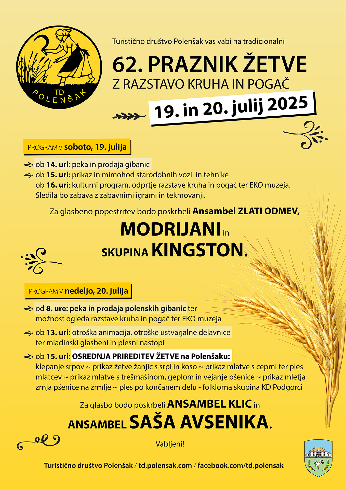 • 15:00 - osrednja prireditev - 62. ŽETEV,