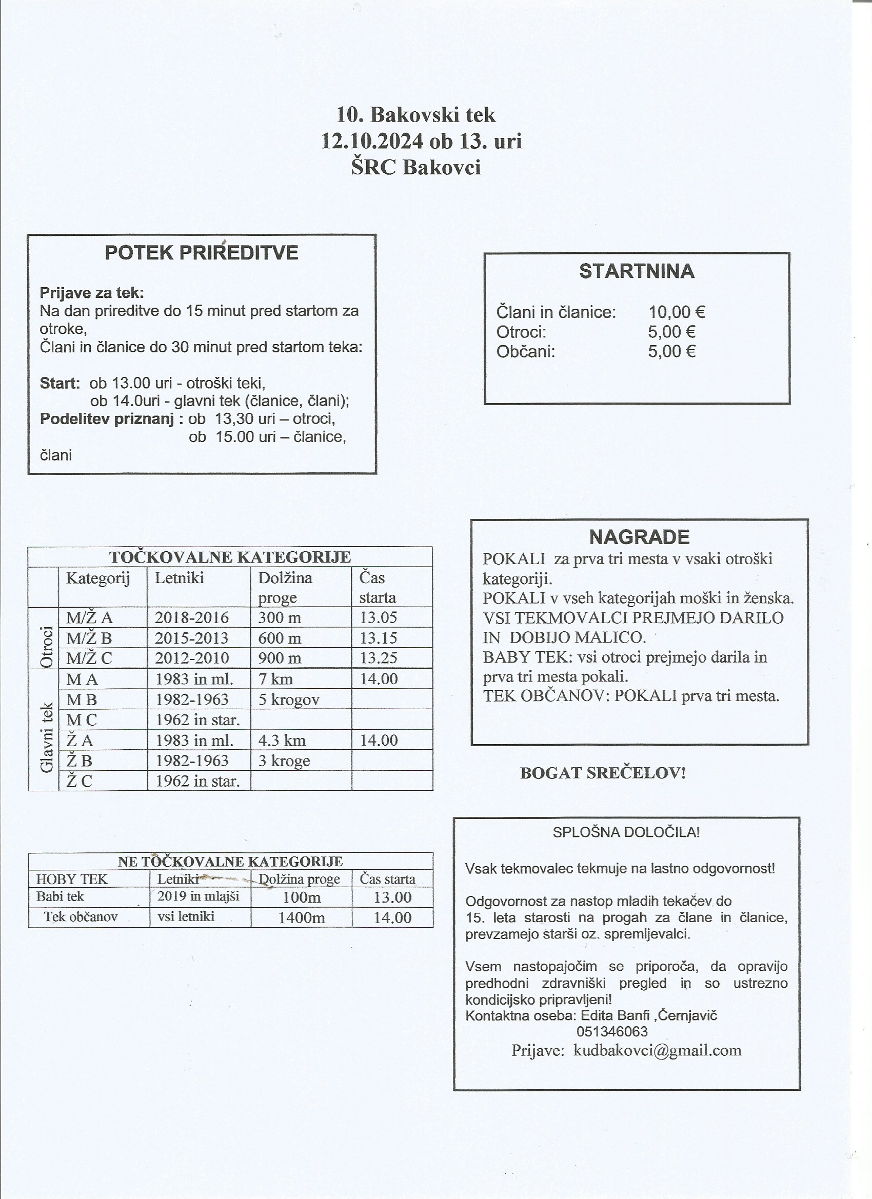 !0.bakovski tek je tradicionalna prireditev. Sodelujejo lahko otroci in odrasli v različnih starostnih skupinah. Prijave zbiramo na kudbakovci@gmail.com