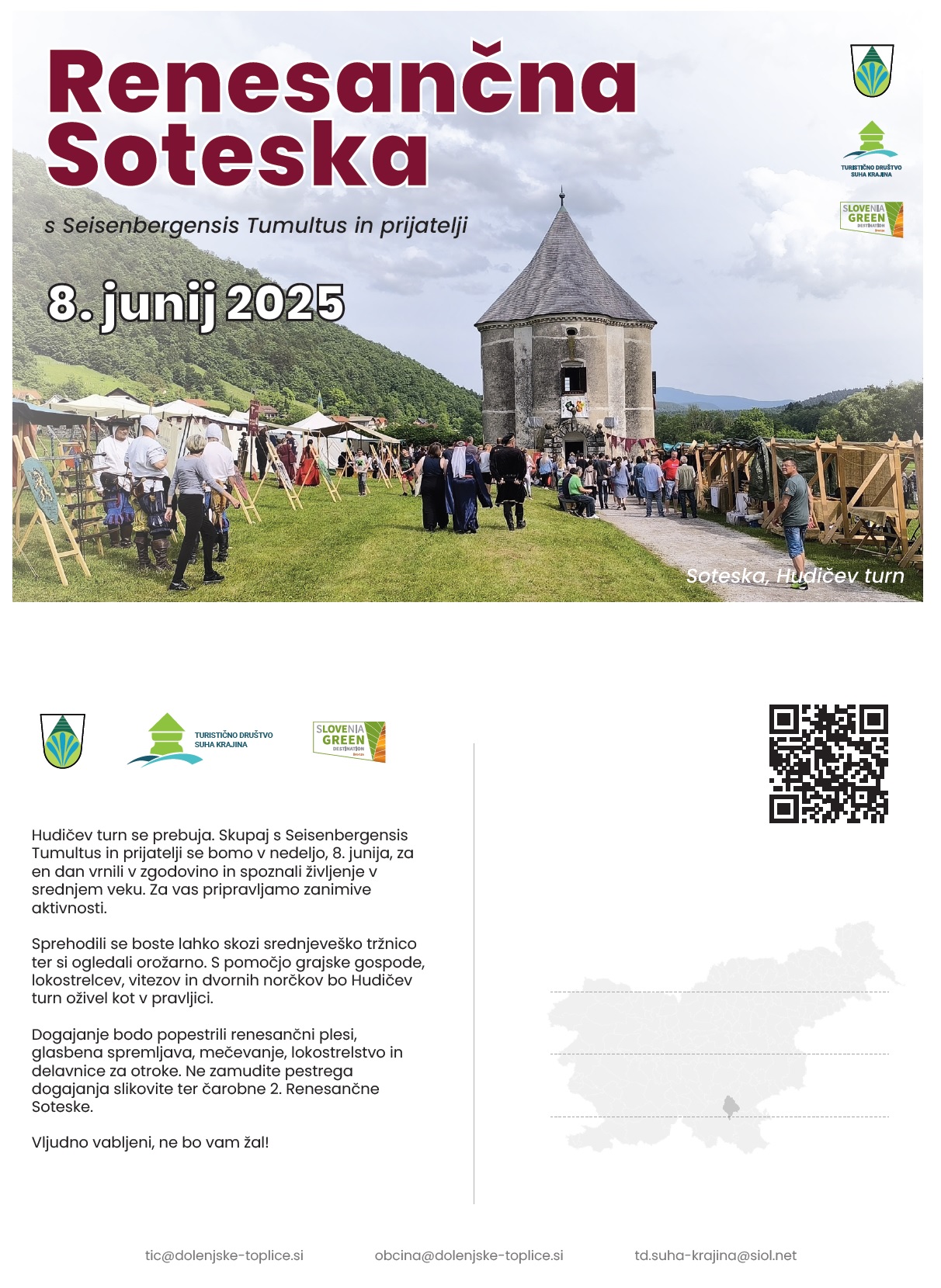 Izjemna zgodovina starega gradu in renesančnega dvorca Soteska ter legende lastnikov obeh gradov, kar same po sebi vabijo, da Soteska v občini Dolenjske Toplice, zaživi v čarobni srednjeveški prireditvi RENESNAČNA SOTESKA, na zelenici ob Hudičevem turnu pri gradu Soteska.
