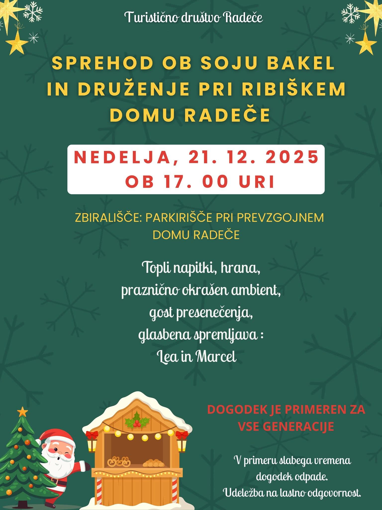 Pot se prične na parkirišču pri Prevzgojnem domu na Hotemežu. Sprehod ob soju bakel z vmesnim postankom in okrepčilom. Na praznično okrašenem prireditvenem prostoru druženje ob pijači in ob prijetni glasbi Leje in Marcela. Presenečenje za otroke.