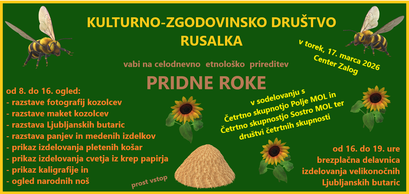 Kulturno-zgodovinsko društvo Rusalka bo v sodelovanju s Četrtno skupnostjo Polje MOL in Četrtno skupnostjo Sostro MOL ter društvi iz četrtnih skupnosti pripravilo celodnevno etnološko prireditev PRIDNE ROKE, v torek, 17. marca 2026, od 8. do 19. ure, v Centru Zalog, Zaloška cesta 267, Ljubljana Zalog.