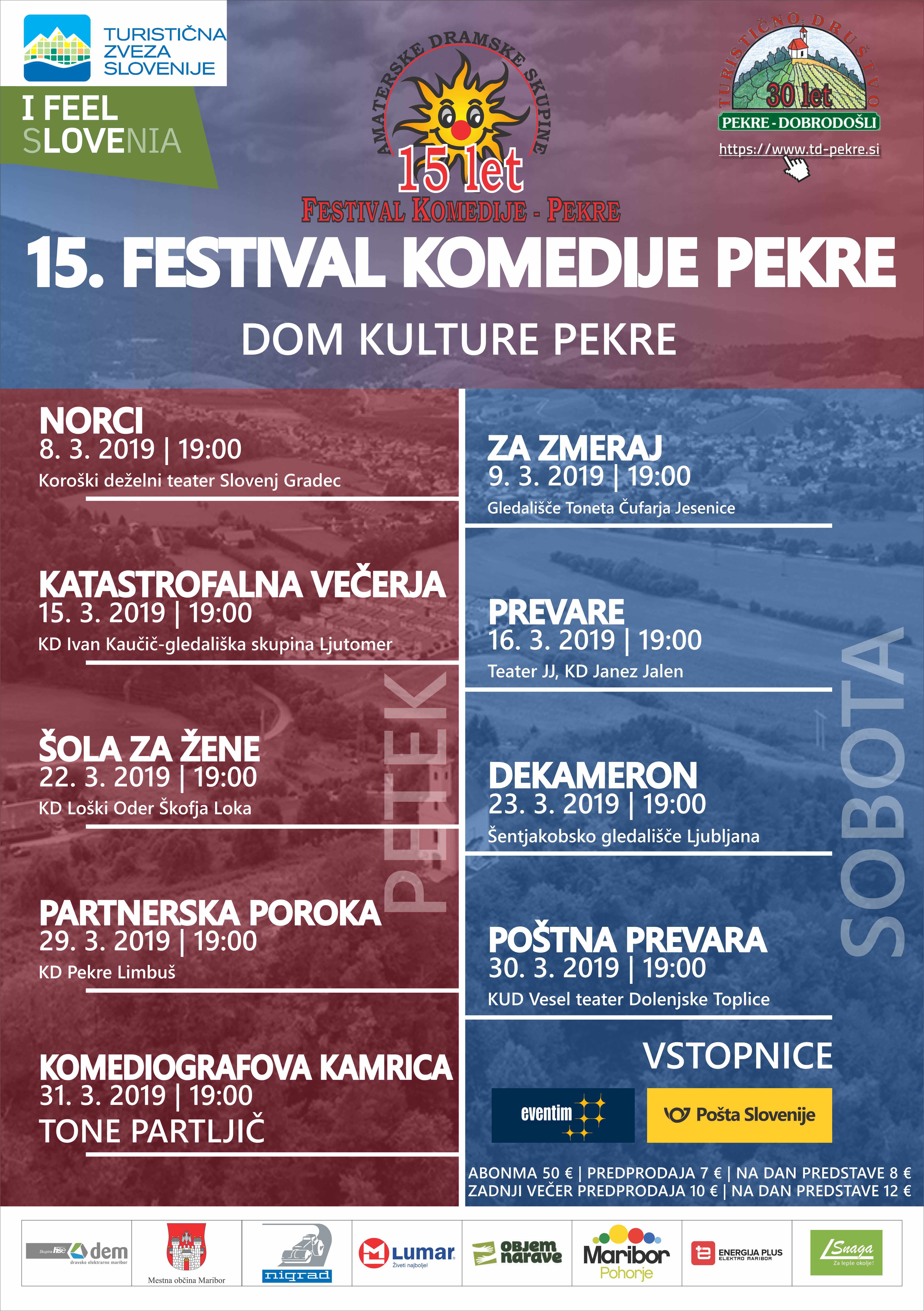 Festival komedije Pekre tradicionalno pripravljamo vsako leto v mesecu marcu, vsak petek in soboto, letos že petnajstič. Na festivalu sodelujejo izključno amaterske dramske skupine - 8 predstav.