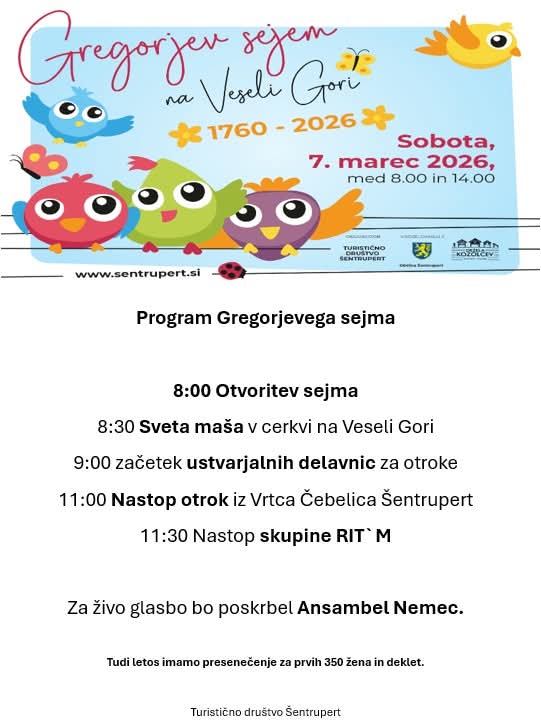 vabimo vas na tradicionalni Gregorjev sejem na Veseli Gori, ki bo 7. marca od 8 do 14 ure. Poleg sejma bo letos po dolgih letih organizirana tudi sveta maša. Upamo, da bo letos suho vreme saj pripravljamo tudi spremljevalni program. Program bo javno objavljan čez nekaj časa.